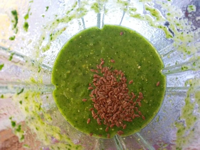 Добавляем овсяные хлопья и льняное семя. Взбиваем еще раз.