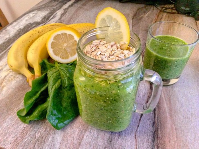 Разливаем по бокалам. Сверху в стаканы можно выложить еще по ложке овсяных хлопьев. Украшаем лимоном. Отличного дня!
