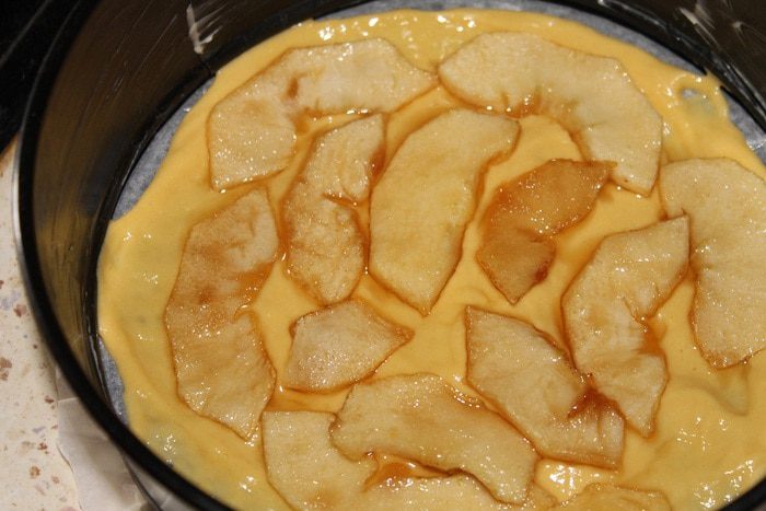 Форму d-18см застелить пергаментом и смазать сливочным маслом. Выложить 3 ст. л. теста, сверху распределить карамельные яблоки.