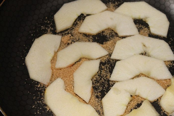 Яблоко очистить, разрезать пополам, вырезать семенную коробочку. Одну половинку яблока нарезать ломтиками, сложить в сковороду и посыпать 2 ст. л. сахара. Карамелизировать, периодически переворачивая ломтики.