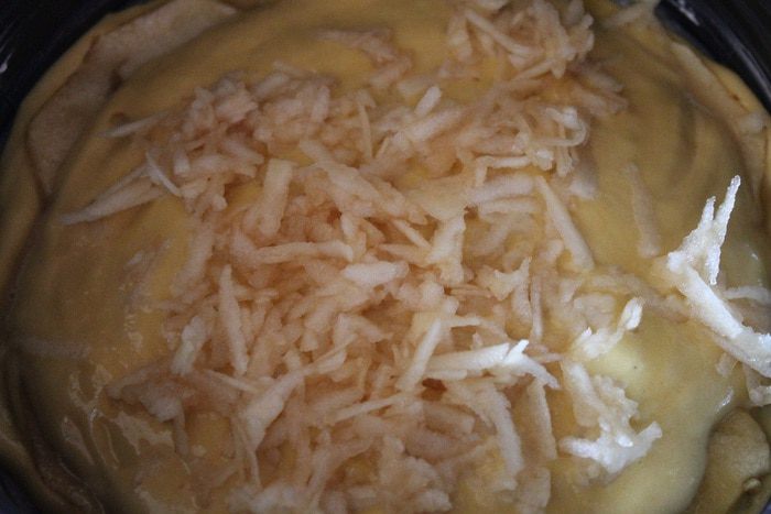 Далее еще 3 ст. л. теста и половинку оставшегося яблока натереть на крупной терке. Сверху выкладываем оставшееся тесто, разравниваем лопаткой. И ставим в заранее разогретую до 190 градусов духовку на 30-40 минут. Готовность проверить шпажкой.