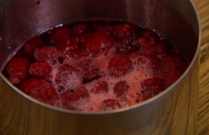 Приготовить малиновый соус: в небольшой кастрюле соединить сахар, 2–3 горсти малины, влить лимонный сок, 2 ст. ложки воды и все припустить, затем протереть через сито и вернуть на огонь, чтобы соус слегка уварился.
