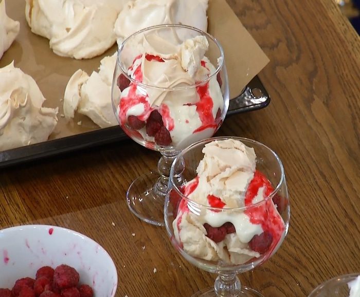 Такой десерт называется Eton Mess — «Беспорядок в Итоне», его дают мальчикам в знаменитой английской школе, которая считается одной из лучших в мире. Слово «беспорядок» в названии появилось потому, что меренга поломана на кусочки и смешана со сливками и клубникой. У меня этот десерт немного à la russe — что-то вроде беспорядка в Царскосельском лицее! Готовый крем из сливок, если будете использовать его не сразу, поставьте в холодильник.