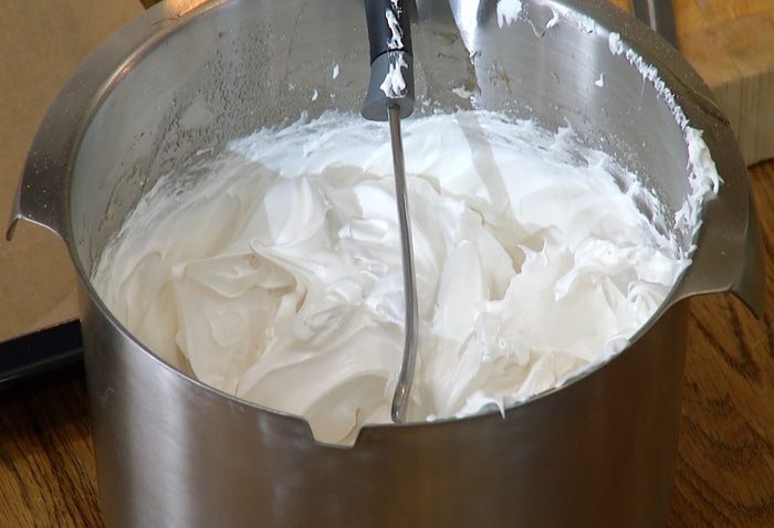 Приготовить меренги: яичные белки взбить в комбайне, затем, продолжая взбивать, влить ванильный экстракт, а через пару минут добавить уксус.