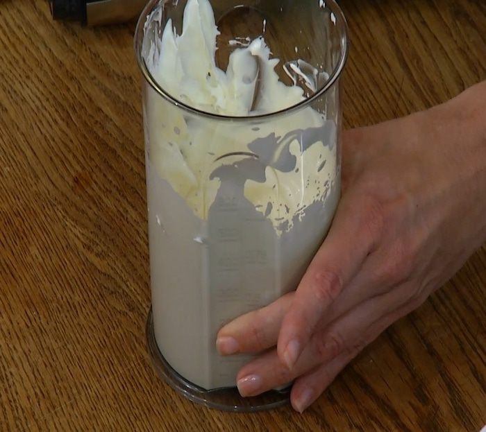 Приготовить крем: сливки взбить блендером с насадкой-венчиком, затем добавить сметану и перемешать все ложкой.