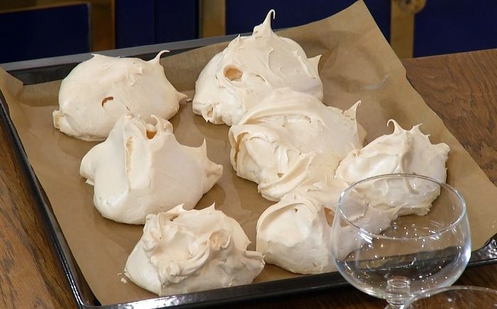 Противень выстелить бумагой для выпечки, ложкой выложить меренги, поместить в разогретую духовку и понизить температуру до 130°С. Выпекать меренги полтора часа, затем оставить в выключенной духовке, ни в коем случае не открывая дверцу!