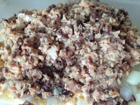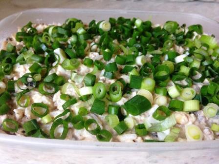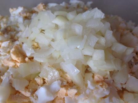 Добавить нарезанный мелко и ошпаренный кипятком (чтобы не горчил) лук.