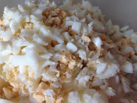 Добавить к рису сваренные вкрутую и нарезанные яйца.