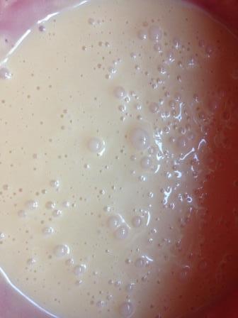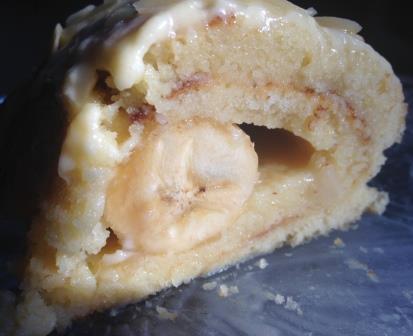 Горячий корж выложить на влажное полотенце, скрутить в рулет, подождать пока остынет. Раскрутить, намазать кремом (немного оставить для украшения), выложить на край банан и снова завернуть. Готовый рулет намазать кремом и притрусить орехами.