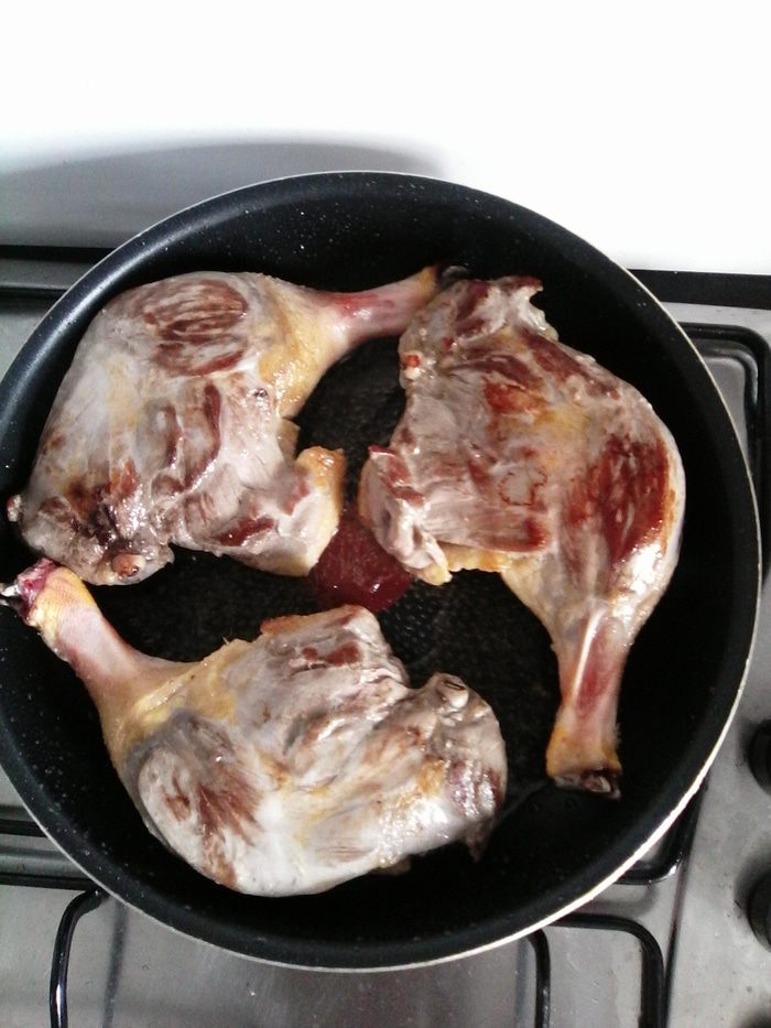 Обжариваем утку с двух сторон до золотистого цвета. У меня ножки, но можно тоже самое сделать с целой уткой (или половиной) и в большой емкости (казане, кастрюле, глубокой сковородке и т.п.). Утку перекладываем в тарелку, жир, оставшийся от жарки, нам не пригодится, его можно выливать.
