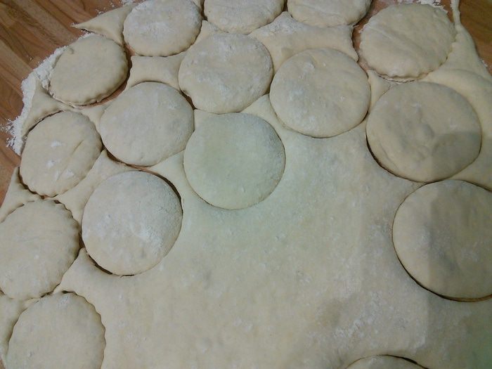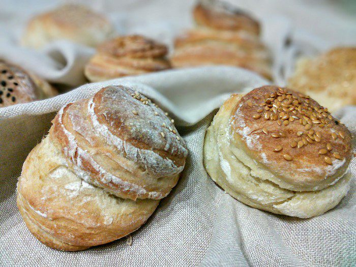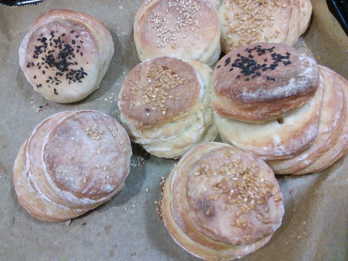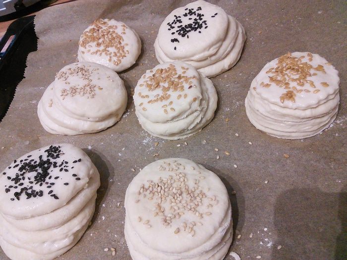 Из них построить башенки, каждую по 4 кружочка. Каждый кружочек предварительно смазать водой прежде чем положить на него следующий. Немного прижать. По желанию посыпать кунжутом, льном и т. д. Выложить булочки на противень, покрытый пекарской бумагой. Накрыть полотенцем и оставить на подход на 45 минут. У меня тесто росло во время работы с ним, поэтому я поставила булочки печься сразу.