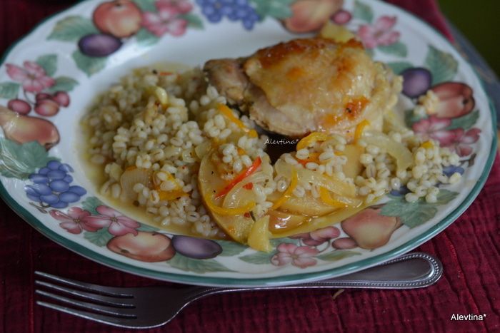 Добавить бульон и перловую жемчужную крупу. Тушить, убавив огонь, примерно 10 мин. В жаропрочное блюдо переложить перловку с овощами, сверху куриные бедрышки, посыпать специями. Закрыть фольгой и поставить в разогретую духовку на 190 гр. на 45 мин.