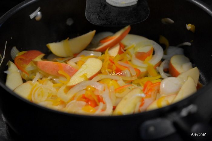 Добавить порезнное зеленое яблоко, как Гренни Смит, например. Специю карри и тушить еще 5 мин, помешивая.