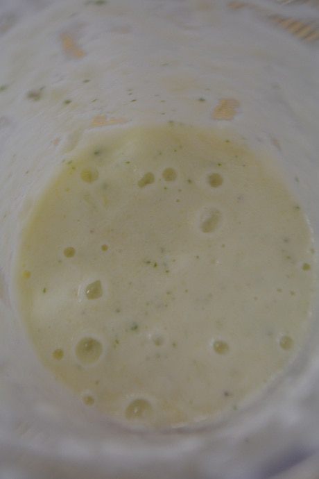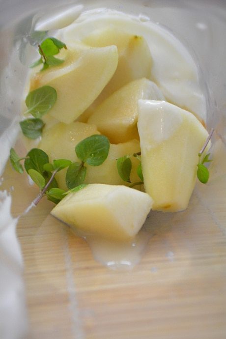 В чаше блендера смешать йогурт, листики мяты, сок лайма и очищенную от кожуры и семян грушу.