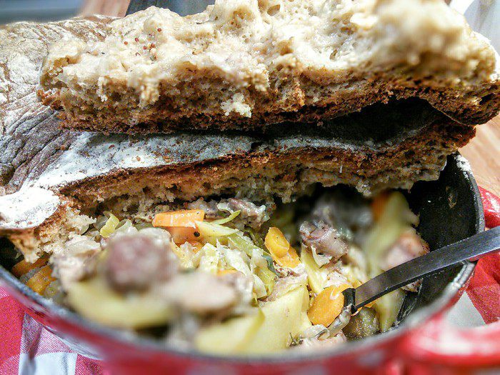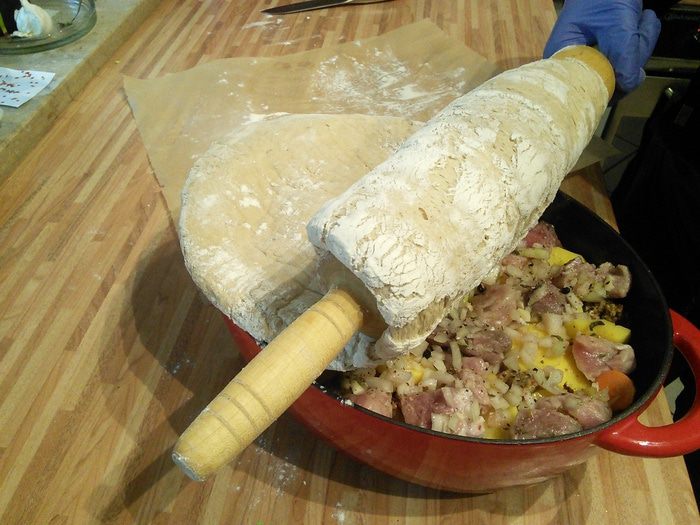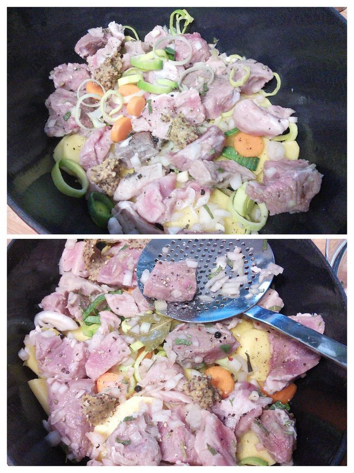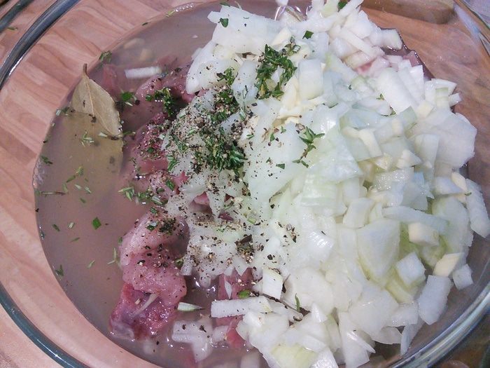 Мясо необходимо замариновать на ночь. Для этого его нужно помыть, обсушить, избавить от жилок и плёнок, нарезать на порционные кусочки. Мелко нарезать лук и чеснок, листики тимьяна отделить от веточек. Мясо соединить со всеми ингредиентами маринада, залить вином, поперчить, хорошенечко перемешать, накрыть ёмкость и оставить мясо мариноваться минимум на 12 часов. От себя я добавила щепотку свежего розмарина и шалфея.