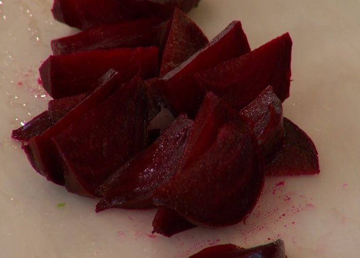 Запеченную свеклу почистить и порезать тонкими дольками.