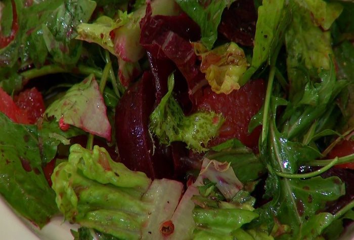 Листья салата и руколу соединить в глубокой салатнице со свеклой и грейпфрутом, полить оливковым маслом, уксусом, посолить, поперчить, посыпать розовым перцем и все перемешать.
