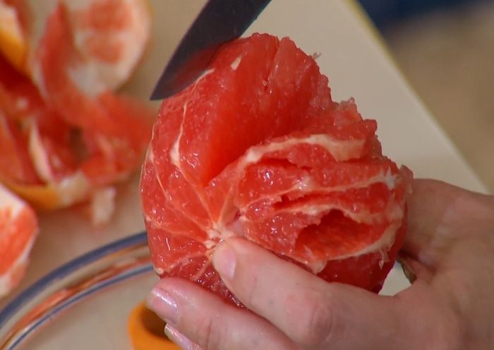 Грейпфрут почистить, затем вырезать мякоть, сохранив выделившийся при этом сок.