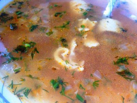Закинуть в кастрюлю промытый рис. Когда он сварится, заправить суп луково-томатной заправкой и проварить еще минут 5. Добавить кинзу.