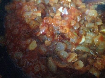Добавить томатную пасту, аджику, специи, нарезанный чеснок и обжарить еще несколько минут.
