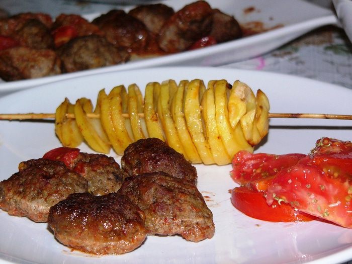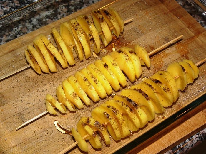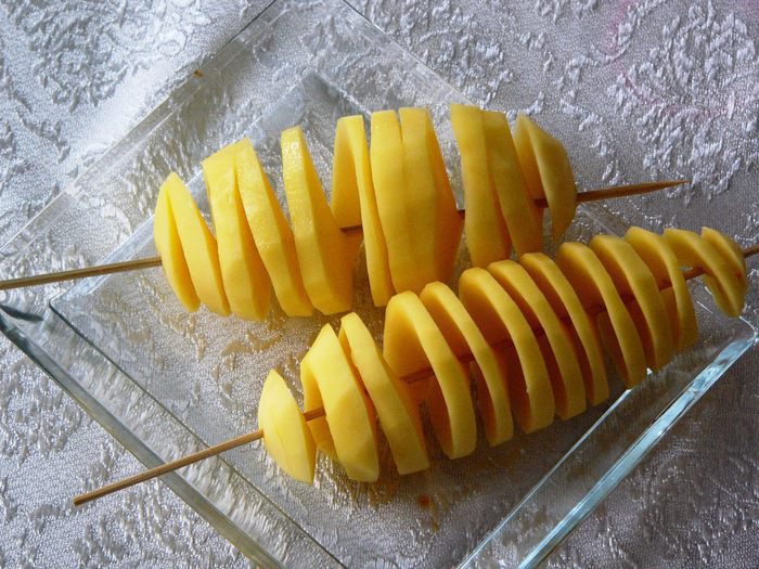 Второй вариант - нарезать картофель кольцами и нанизать на шпажку на небольшом расстоянии друг от друга.