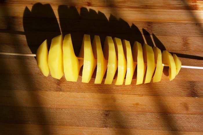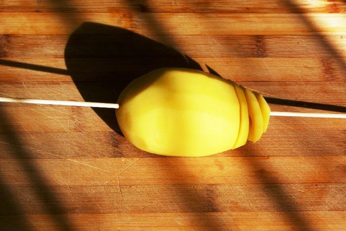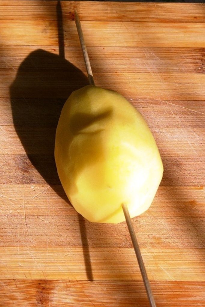Дорезаем до конца и аккуратно растягиваем порезанную картофелину вдоль шпажки.