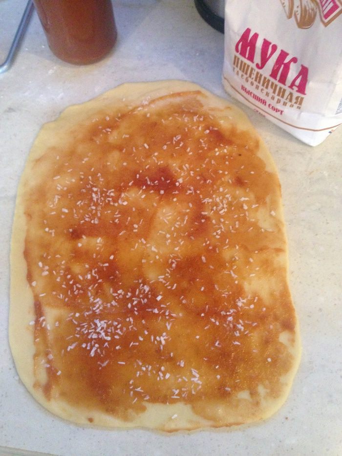 Смазываем повидлом (у меня яблочное) и посыпаем миндалем или кокосовой стружкой.