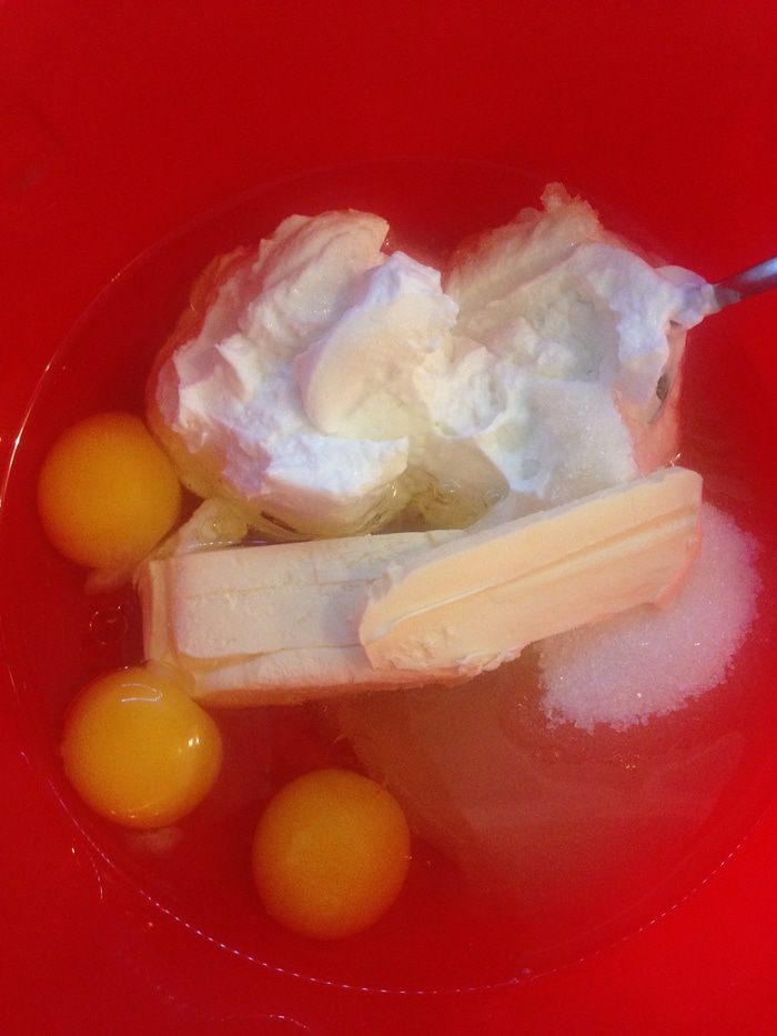 Творог берем мягкий пастообразный. Смешиваем все ингредиенты для теста, кроме разрыхлителя и муки.