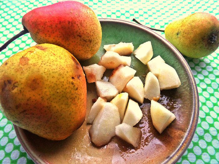Груши у меня мелкие, местные, очень сочные. Чистим, делим на кусочки.