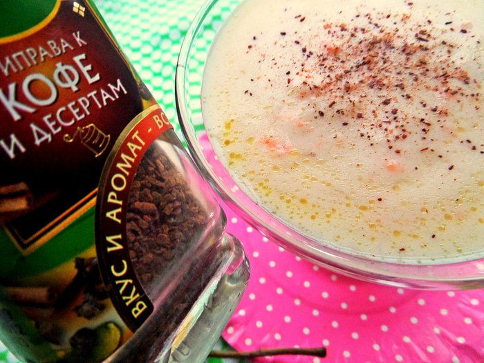 Верх посыпаем приправами для десертов из меленки. В ней такой состав: гвоздика, корица, коричневый сахар, кардамон, ваниль. Или берём щепотку корицы!