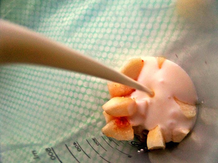 Заливаем кусочки груш в чаше для взбивания йогуртом.