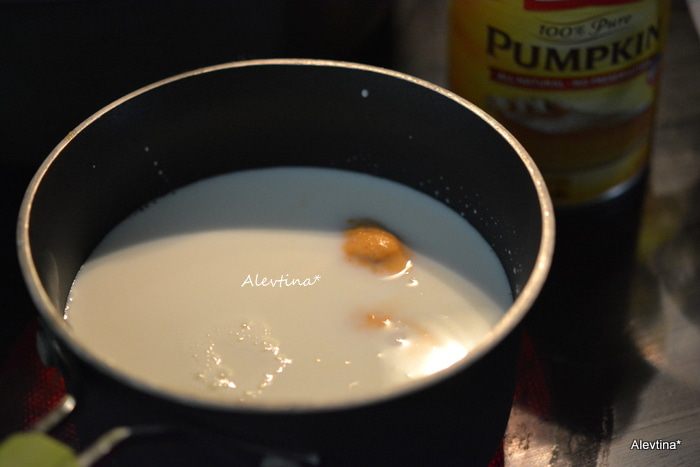 Молоко, тыквенное пюре, сахар добавить в небольшую кастрюлю. Поставить на огонь, помешивая варить, не доводить до кипячения.