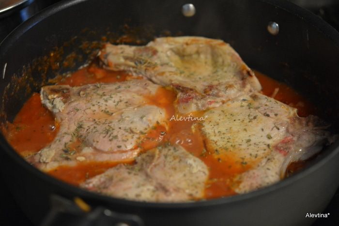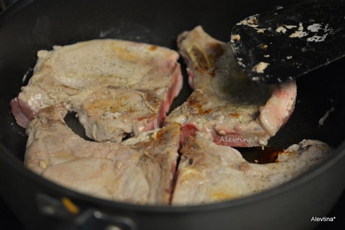 На горячей сковороде разогреть две столовые ложки масла. Выложить свинину на косточке тонкой нарезки. Посолить и поперчить с обеих сторон. Обжаривать примерно по 3-5 минут каждую сторону. Переложить затем на тарелку.