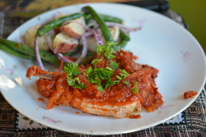 Подаем свинину к столу с готовым гарниром, полив томатным соусом. Посыпать сверху зеленью. Приятного аппетита!