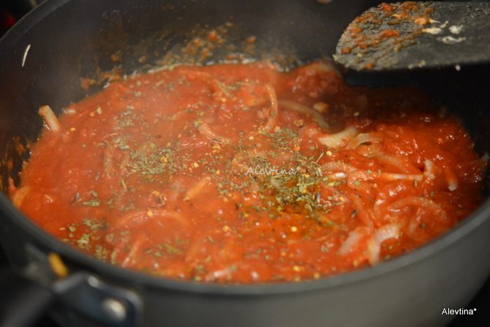 Добавить томаты (мелко порезанные) баночные в соку, специи прованские, красный перец хлопьями. Закрыть крышкой и тушить 15 минут.