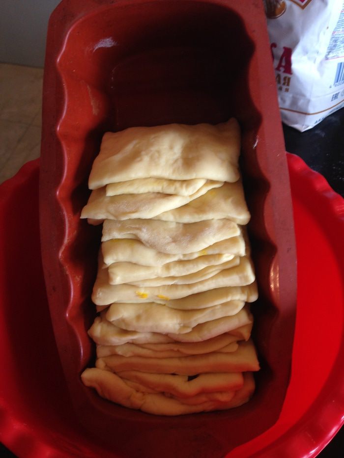 Форму для хлеба ставим под наклоном и выкладываем квадратики поочередно, не прижимая друг к другу. В таком положении оставляем форму с хлебом минут на 30 (накрываем чистым кухонным полотенцем).