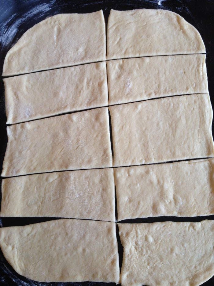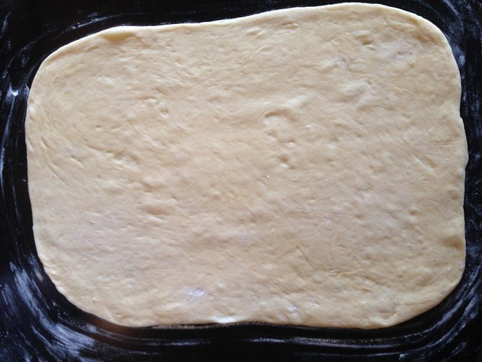 Через час нужно вымесить тесто еще раз и затем раскатать пласт примерно 24х30 см (длина по размеру формы).