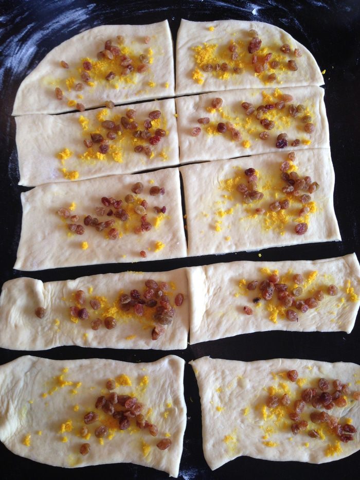 Смазываем тесто маслом и посыпаем равномерно сахаром каждый кусочек, затем раскладываем цедру и изюм.