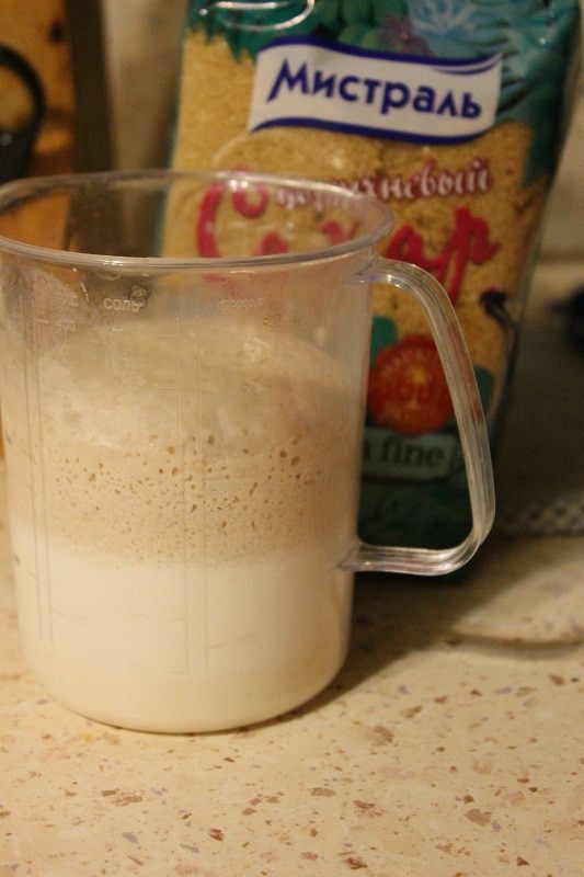 Приготовим сначала опару, для этого нужно подогреть молоко до теплого состояния, добавить дрожжи, 1 ст. л. сахара и 1 ст. л. муки. Перемешать венчиком, накрыть емкость полотенцем и оставить на 20 мин.
