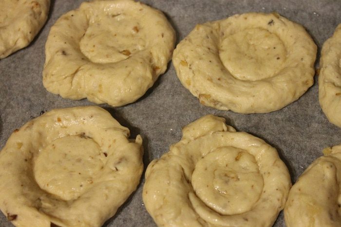 Подошедшее тесто разделить на 10-12 шариков. Противень застелить пергаментом и смазать 1 ст. л. растительного масла. Шарики из теста выложить на противень слегка приплюснуть ладошкой. Затем берем кружку или стакан и дном надавливаем на приплюснутые лепешки.