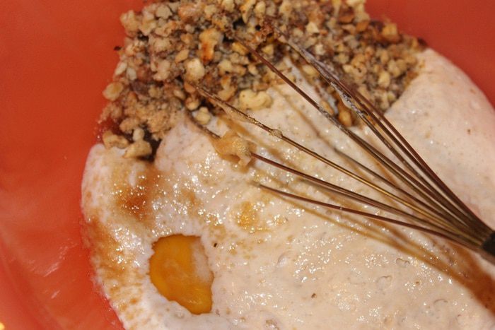 Подошедшую опару перелить в глубокую миску, туда же добавить яйцо, сахар и мелко нарубленные орехи. Перемешать.