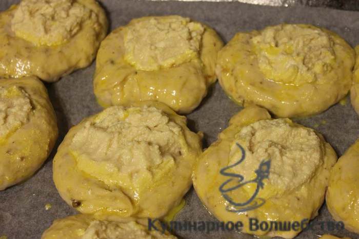 В выдавленную серединку кладем начинку, а края ватрушек смазать яйцом. Выпекать в заранее разогретой до 190 градусов духовке 30-40 минут. До красивого румяного цвета.