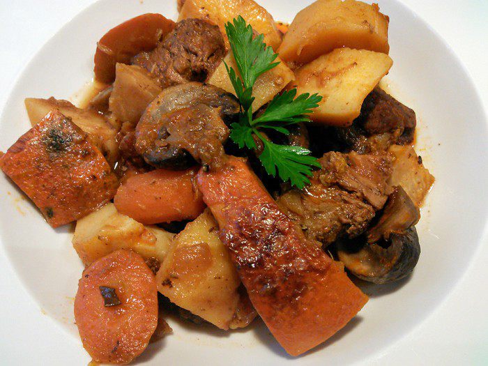 Когда мясо будет почти готово, добавить к нему овощи, перемешать и тушить 20 минут. Не забудьте продлить жидкости, если это необходимо.