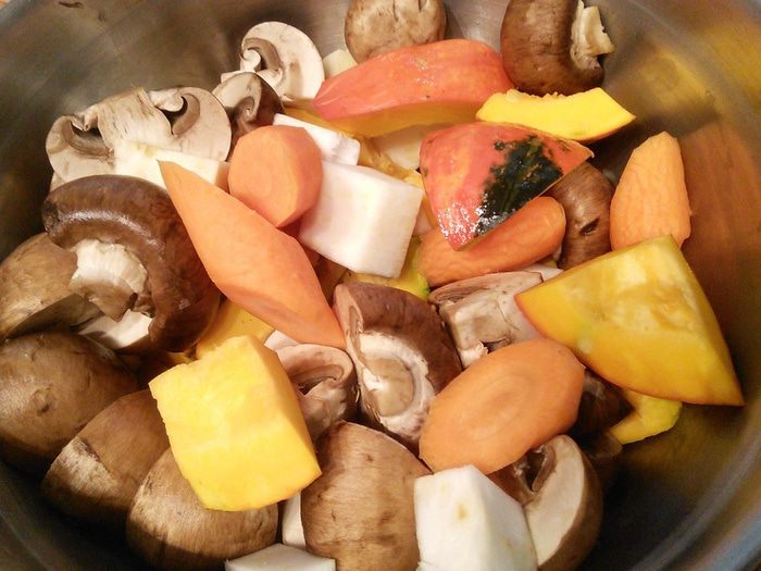 Овощи очистить, крупно порезать. Шампиньоны в зависимости от размера на четвертинки, половинки или целиком. Картошку крупными кусочками.