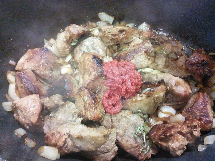 Добавить томатную пасту, перемешать и быстро обжарить.