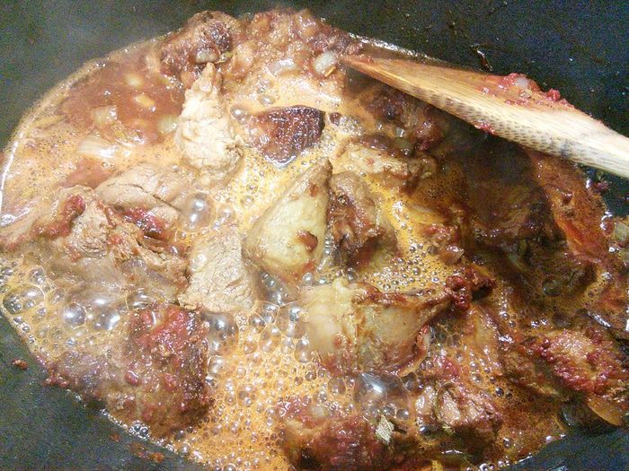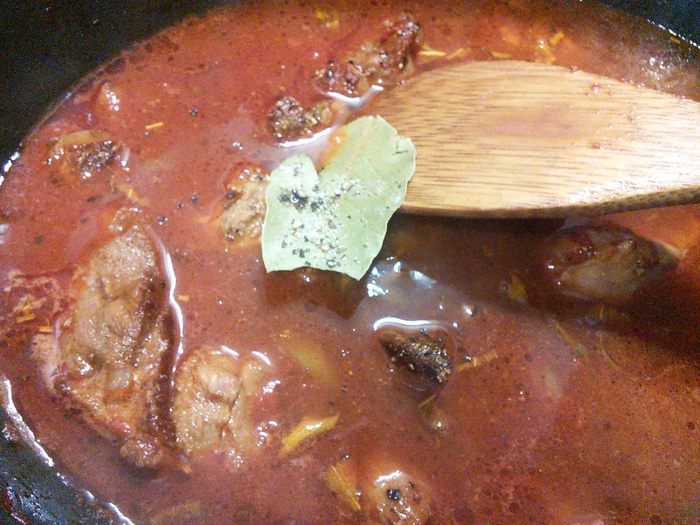 Влить пиво и бульон (у меня вода), посолить, поперчить, добавить лаврушку и тушить до готовности мяса.