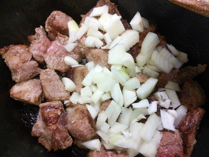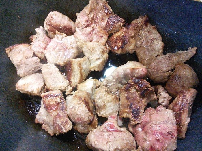 В чугунке разогреть топлёное масло, обжарить мясо со всех сторон до золотистой корочки.