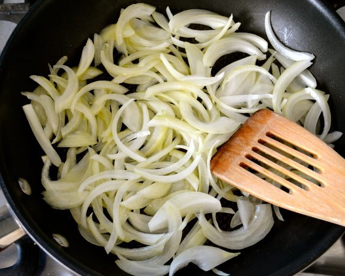 Лук очистить и нарезать перьями. Сковороду разогреть на среднем огне и добавить 1 ст. л. Обжарить лук до мягкости, помешивая, минуты 3-4. Слегка посолить и присыпать чуть-чуть сахаром. Переложить лук со сковороды в тарелку.