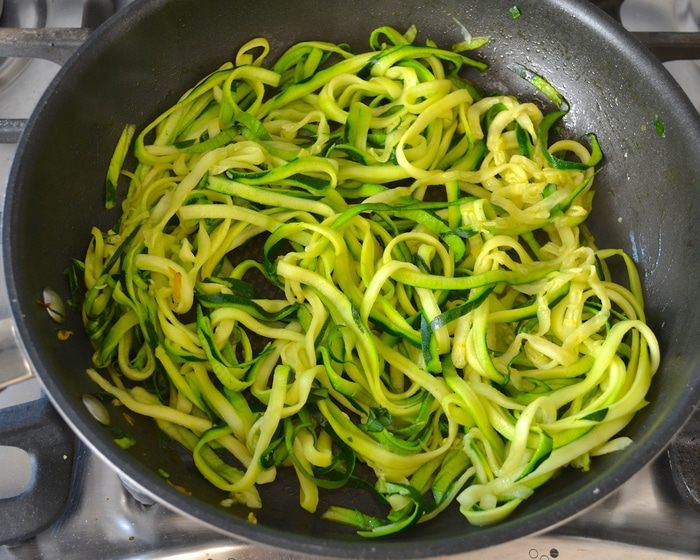 В сковороду выложить цукини. Осторожно помешивая, подержать на огне пару минут, но не солить и не добавлять сахара, иначе цукини пустят воду.