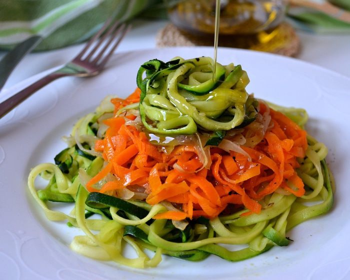 Последнее время все чаще встречаю в интернете рецепты "спагетти" (или лапши) из цукини! ))) Способов приготовления таких "спагетти" не мало. Конечно, для этого нужно использовать специальную тёрку-овощерезку... Но, если Вам удастся приобрести подобное приспособление, очень советую попробовать вот такую оригинальную овощную закуску из овощей, которая может послужить и отличным гарниром к мясным блюдам! Мои дети съедают двойную порцию этих "спагетти"! Надеюсь и ваши умники и умницы их оценят!
